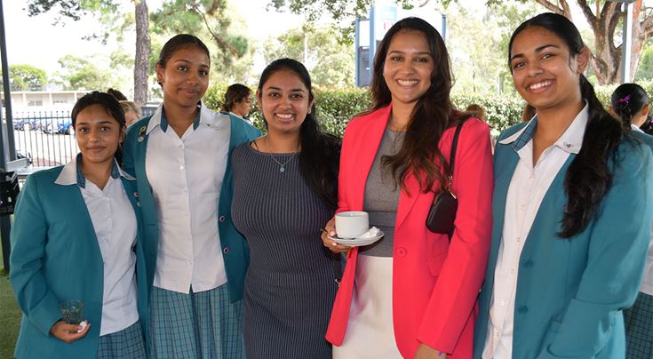 Melissa Doueihi, Class of 1992; Donna Davis MP, Member for Parramatta; Mary Refalo, School Principal and School Captains at the International Women's Day morning tea.